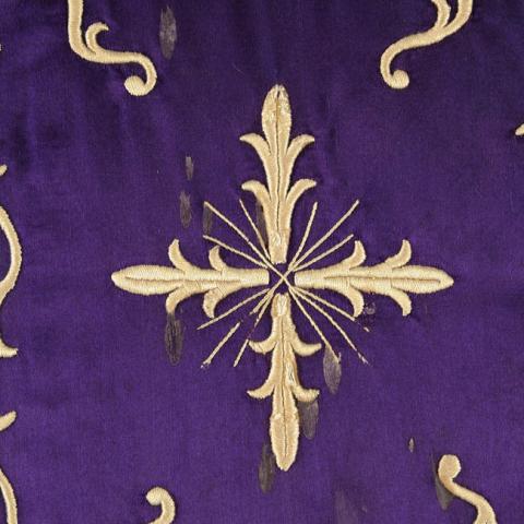 Objeto cuadrado formado por dos hojas rígidas abierta en un extremo lateral, unida a los lados con tela. Cubierta de tela morada, presenta una cruz central y bordes bordados.