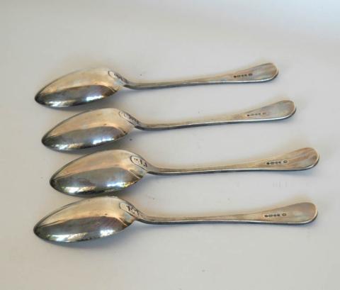 Objeto de uso doméstico. Cuatro cucharas metálicas, con decoración en el mango y receptáculo. Decoración basada en ondas que conforman volutas que se repiten en el mango y en el borde del receptáculo, en el centro franja que encierra un campo liso con decoración simétrica. Caja de madera forrada en tela en color negro por fuera y blanco por dentro.