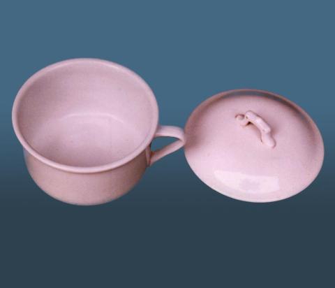 Objeto de uso doméstico. De forma cilíndrica, lleva tapadera con asidero y asa lateral. fabricada en loza de color blanco.