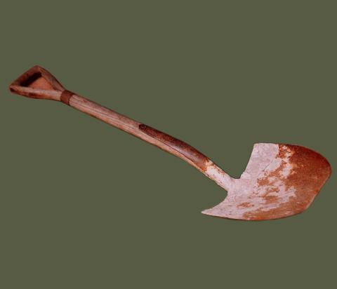 Herramienta de uso agrícola compuesta por una superficie semicircular de trabajo en el extremo distal y un mango cilíndrico rematado en un asa de orientación horizontal. Hierro remachado y madera de color marrón.