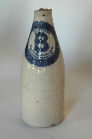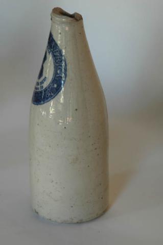 Objeto de uso doméstico. Contenedor cilíndrico elaborado en gres. Boca restringida con reborde. Base plana. Superficie lisa de color crema, que en la parte superior presenta una inscripsión en letras azules.