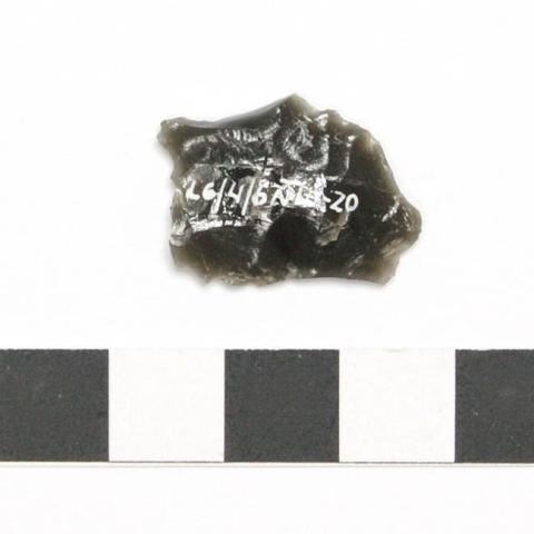 Lasca trabajada de forma bifacial, de color negro con tintes grisáceos, variedad translúcida. Tiene un vástafgo en un extremor