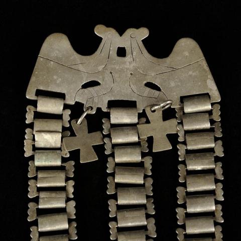 Adorno pectoral elaborado en metal compuesto por tres cadenas de eslabones paralelas, la parte superior tiene la forma de dos aves que se juntan en el centro, de las que cuelgan dos cruces. La parte inferior tiene la forma de un trapecio con decoración incisa del cual penden diez monedas achatadas.