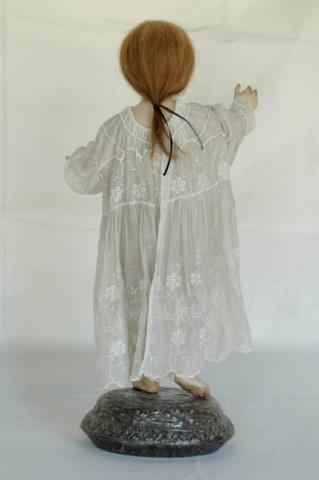 Figura masculina de bulto de niño, desnudo, con peluca de pelo natural, de pie sobre una base de madera cubierta con lámina de plata. Vestido con túnica blanca con encajes.