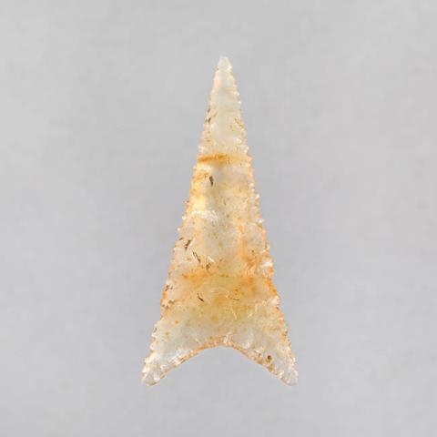 instrumento de color anaranjado y de alta transparencia. Tiene talla bifacial y retoque bimarginal doble. Los bordes están dentados; la base es escotada