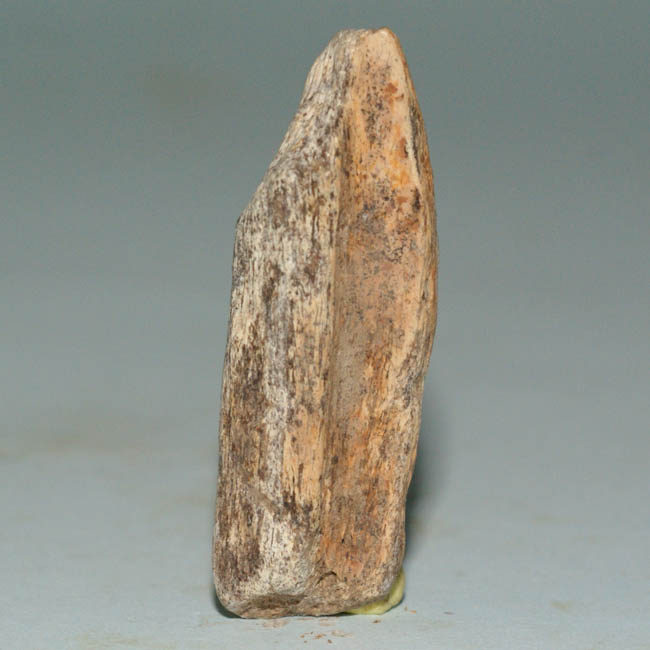 Artefacto de forma alargada terminado en punta, de color marfil con manchas marrones y grises. Se observa aumento de la porosidad y baja en la densidad de la materia prima