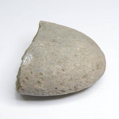Fragmento de canto de río, color gris, forma oblonga (trapezoidal con las esquinas redondeadas) y erosionada, base plana . El perfil es plano convexo y la cara funcional es plana y picoteada