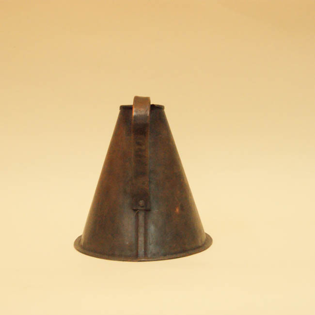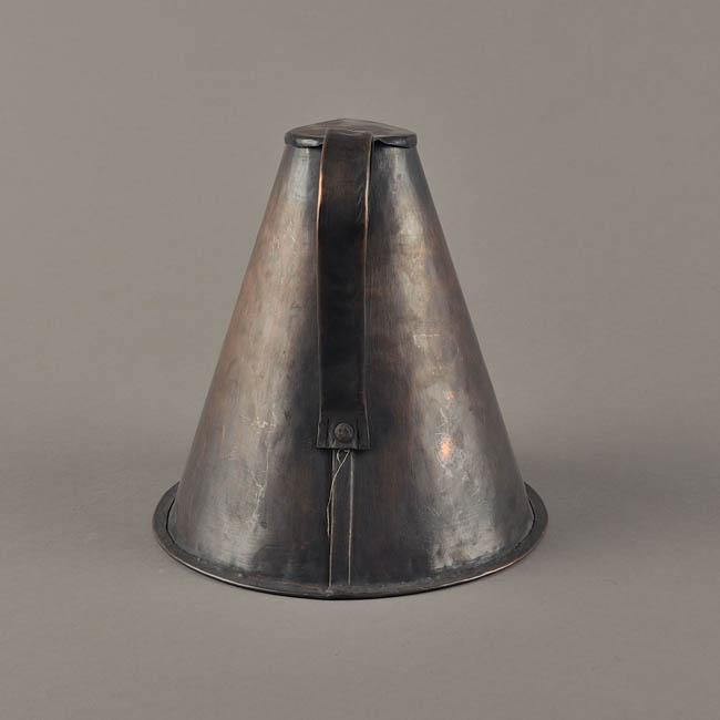Objeto de uso doméstico, utilizado como contenedor de líquidos. Recipiente de forma de cono con base plana, asa y tapadera.