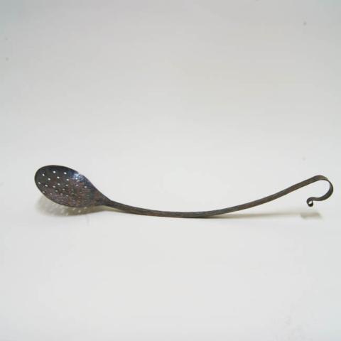 Objeto de uso doméstico. Utensilio en forma de cuchara perforada con mango largo curvado, utilizado para freír.