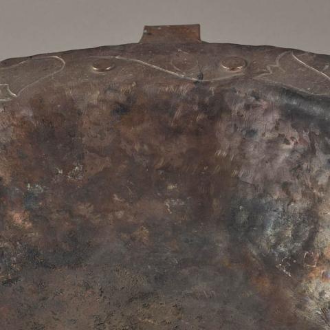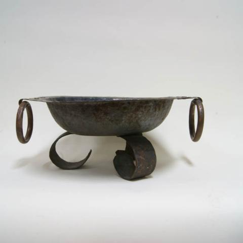 Objeto de uso doméstico, utilizado como medio de calefacción. recipiente cóncavo con borde plano, del cual penden dos argollas, a modo de asa. Cuenta con tres patas constituidas por franjas metálicas curvadas.