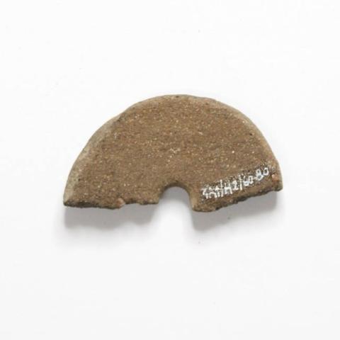 Mitad de un disco cerámico con una horadación central bicónica. La superficie exterior es de color negro y está alisada y pulida, la superficie interior es color marrón y está alisada; los bordes están alisados