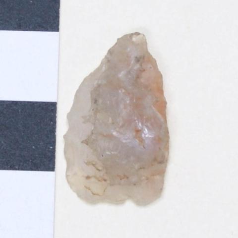 Instrumento d ecolor blanco con vetas rojizas, traslúcido, base apedunculada y levemente cóncava, retoque bifacial