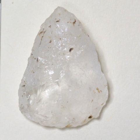 Instrumento de base convexa y de color blanco variedad tranaslúcida. Tiene talla bifacial y retoque bimarginal