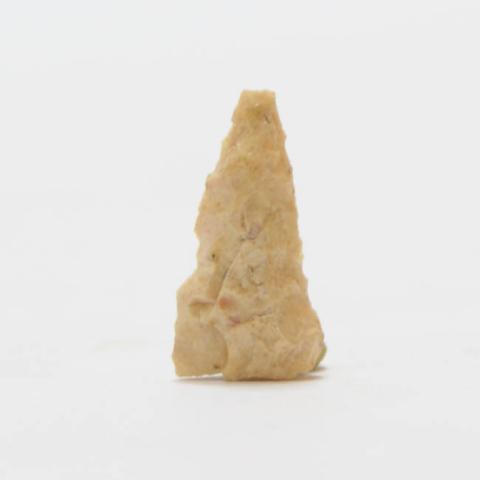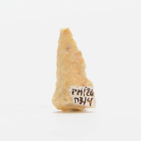 Pieza quebrada pequeña de color amarillento marfil. Tiene talla bifacial y retoque bimarginal; la base y el ápice están ausentes.