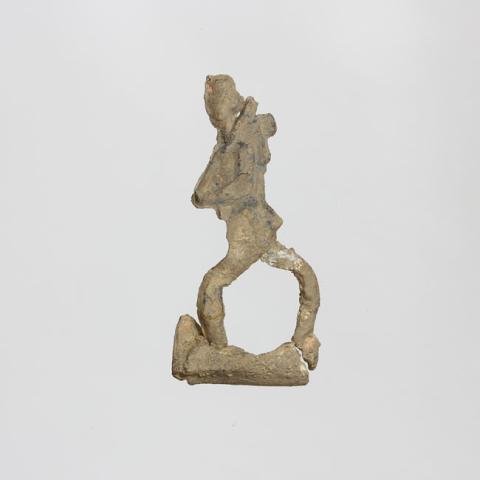 Figura de un soldado vestido con uniforme y gorra, marchando con el fusil al hombro y afirmado en la mano izquierda, el brazo derecho colgando, a la espalda un bulto. Se afirma sobre una base de forma rectangular, quebrada y doblada; los pies están abiertos en arco. La figura es bidimensional, y tiene un color gris.