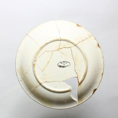 Pieza importada de forma circular, restaurada, con un pequeño faltante en la pared. Es de color blanco y de pared lisa; está decorada con una franja perimetral pintada de color azul en la superficie interior. La pared es convexa de borde redondeado y levemente evertido. El pie es convexo y redondeado que deja un fondo anular y plano. En la base tiene impresa la marca de fábrica con trazos de color negro que forman un óvalo donde se inscribe la leyenda “MADE IN Czechoslovakia”. Pieza de loza blanca