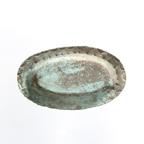 Pieza completa de forma ovoide y de color violáceo oscuro, cubierto en partes por una capa de óxido de cobre. Es una pieza simétrica y de perfil simple, con un borde amplio y plano y una concavidad central. Tiene decoración sobre relieve en el borde formando una hilera de puntos.