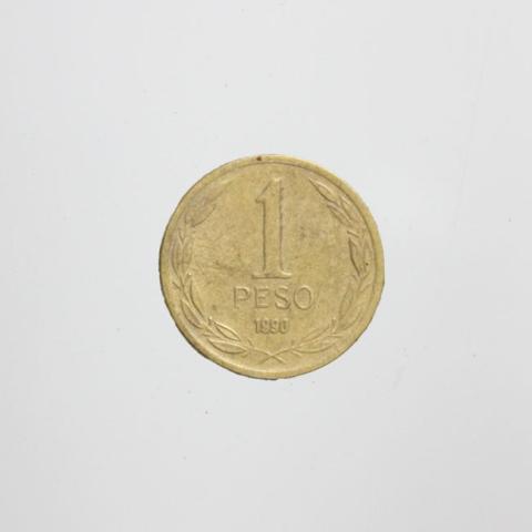 Pieza de forma circular y de color dorado, con óxido en parte del anverso. En el anverso se observa el busto de Bernardo O’Higgins a la derecha, y a su costado la leyenda LIBERTADOR/ B. O’HIGGINS. En el perímetro tiene la leyenda REPUBLICA DE CHILE. Al reverso se observa una corona de espigas perimetral y al centro la denominación y año de acuñación de la moneda: 1/ PESO/ 1990. La gráfila y canto son lisos y el reverso está invertido con relación al anverso.