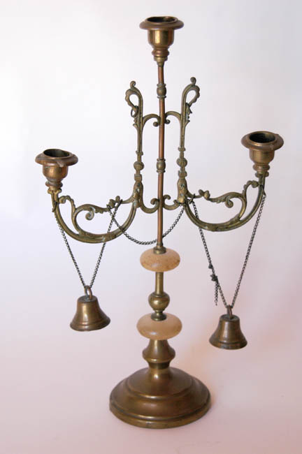 Candelabro de 3 velas, metálico de color dorado, faja central de mayor altura, dos cadenas con campanillas formando guirnaldas.