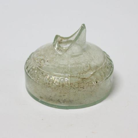 Recipiente simétrico y de perfil compuesto; es incoloro y de variedad traslúcido, sin decoración. El cuerpo es de forma subovoidal y el cuello hiperboloide, los hombros son oblicuos. La base es circular y plana; en el punto de mayor inflexión del cuerpo tiene una franja con la inscripción “ENCRE CHEVENEMENT BORDEAUX”. Tiene faltantes en el cuello y la boca está ausente.