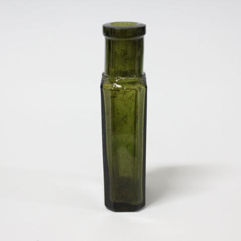 Pieza completa; es de forma rectangular y de color verde oliva, variedad transparente. Es un envase simétrico y de perfil compuesto. La base es rectangular con los ángulos ochavados, borde plano, y con una concavidad central. El cuerpo es rectangular con los borde biselados, de paredes rectas las laterales y levemente cóncavas las centrales; los hombros son pronunciados y angulosos, casi en ángulo recto. El cuello es cilíndrico, la boca es de labio plano y amplio, y de borde evertido y recto, con preparación para cierre a presión con tapón de corcho o similar. Tiene burbujas y se observan dos costuras laterales que abarcan el cuerpo y cuello. En la base tiene grabada la inscripción I C/ 509