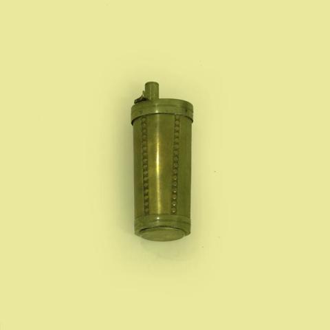 Conjunto de arma de fuego de mano portátil. Compuesto por polvorín y accesorios. Caja de madera forrada en tela verde, sin tapa y dos cajones con manillas de bronce. Polvorín de bronce de forma cilíndrica con un tubo en su parte superior y cuatro franjas labradas en su superficie. Pinza para balas de metal con dos brazos largos curvados hacia dentro con mecanismo de tijera, rematados en semicírculo cóncava. Tenaza pequeña para balas de metal con dos brazos largos, uno terminado en forma de cubo y otro cilíndrico. Baqueta de madera con un pomo de madera y en el otro una punta de bronce aserrada y estriada.