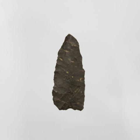 Pieza competa de color negro, y de forma triangular. La base está levemente escotada. Tiene talla bifacial y retoque bimarginal.