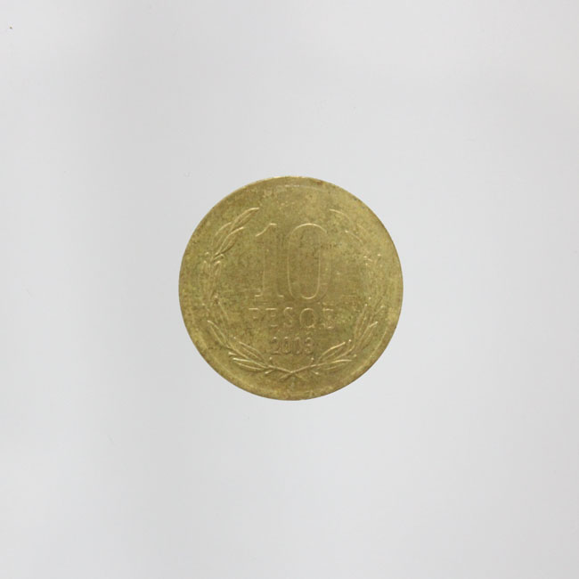 Pieza completa, de forma circular y de color dorado opaco. El anverso tiene la leyenda perimetral con las letras orientadas hacia el interior REPÚBLICA DE CHILE y al centro el busto del prócer a la derecha y en un costado el nombre LIBERTADOR/B. O’HIGGINS. El reverso tiene una corona de espigas y al centro la denominación y año de acuñación 10/PESOS/ 2003. La gráfila es lisa y el canto estriado. El reverso está invertido con respecto al anverso. Pieza fabricada de bronce-níquel.