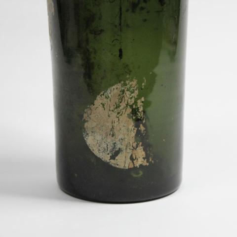 Pieza incompleta, leve faltante en el cuello y boca. Es de color verde oliva y de variedad transparente. Es simétrica y de perfil compuesto. La base es circular y de contorno redondeado, tiene una concavidad central, hay un leve decantador. El cuerpo es levemente cónico invertido; los hombros marcados y redondeados. El cuello es cónico con un abultamiento en el tercio medio y tiene un anillo oblicuo en el tercio superior. La boca es de labio redondeado y de borde amplio, evertido y recto, con preparación para cierre con un tapón a presión tipo corcho o similar. No se observan costuras. Envase fabricado mediante un molde de giro, soplado (vigente entre siglo XIX e inicios del siglo XX). Se conservan restos de dos etiquetas de papel, una rectangular localizada en el centro del cuerpo y otra ovoide puesta en el tercio inferior. La primera muestra una mansión y varios sellos en las esquinas, con la leyenda apenas legible GRAN/ PREMIO….HONO.
