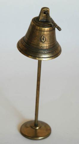 pequeña campana de bronce fundido,con un asa en la paste superior en la que se encuentra amarrada una tira de cuero, en la zona media en sobrerelieve lleva un numero "6" . Su badajo es de hierro