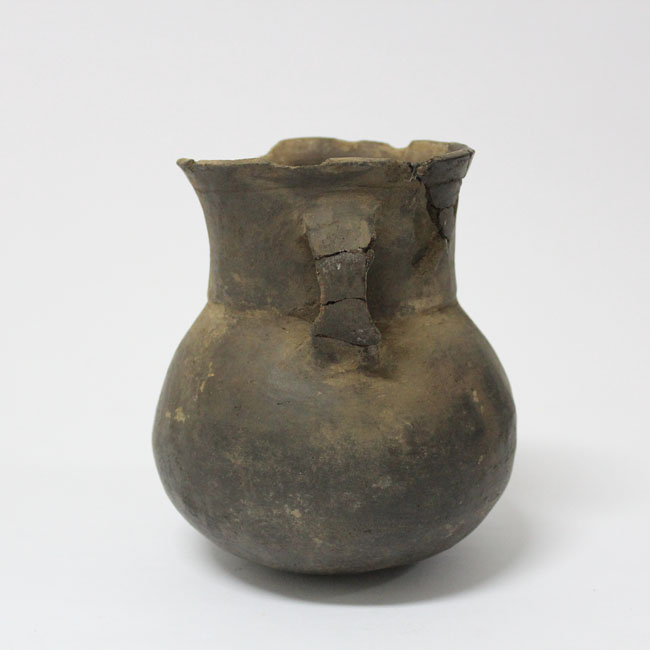 Pieza incompleta, faltantes en el cuello y un asa. Está fracturada y parcialmente restaurada. Es una vasija simétrica de estructura restringida con cuello y de perfil compuesto. La superficie exterior es de color marrón oscuro y está pulida; la superficie interior es de color marrón y está alisada. La base es circular y plana, el cuerpo es de forma ovoide y el cuello es hiperboloide. La boca es de borde evertido y labio plano. Tiene dos asas en arco de correa y en posición vertical con emplazamiento cuerpo-cuello, de inserción traspasada en la unión con el cuerpo y de sección subrectangular. El cuello y cuerpo fueron fabricados como unidades independientes. Tiene decoración incisa anular en el borde y en la unión cuerpo-cuello. La vasija está levemente inclinada en el eje de las asas y la base se apoya horizontalmente bien.