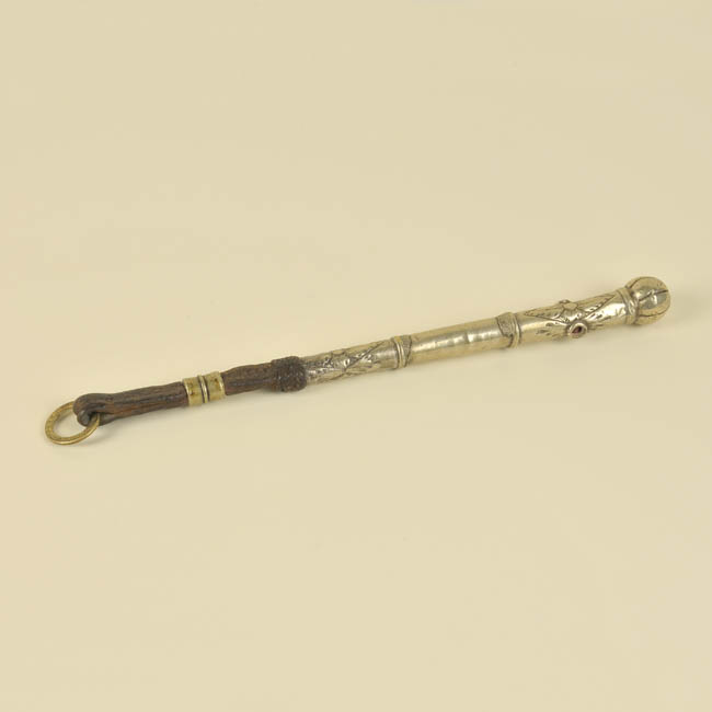 Objeto utilizado por el jinete para apurar a la cabalgadura. De forma cilíndrica que remata en bola en un extremo y una argolla en el otro. Decoración incisa en el cuerpo.