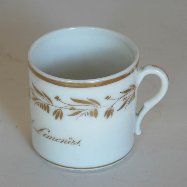 Objeto de forma cilíndrica con un asa. Fabricado en porcelana de color blanco, con decoración de roleos vegetales de color dorado y cintas en la base y en la parte superior. Objeto usado para beber líquidos.
