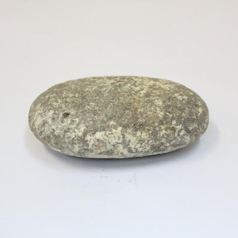 Pieza completa de forma ovoide, y de color gris con claroscuros; tiene restos de sedimento color beige de granulometría muy fina. El perfil es plano convexo, el borde es redondeado y con rebaje en algunos sectores. La cara funcional está aplanada y picoteada. Pieza con textura.