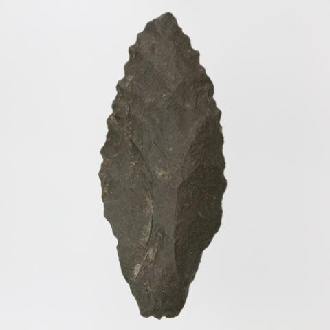 Pieza de forma foliácea, de colo negro. Tiene textura afanítica, y talla bifacial. La base es pedunculada.