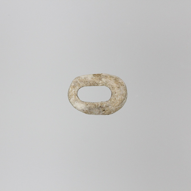 Pieza de forma ovoide, alargada, y de color blanco sucio. Tiene una amplia horadación central y está pulida