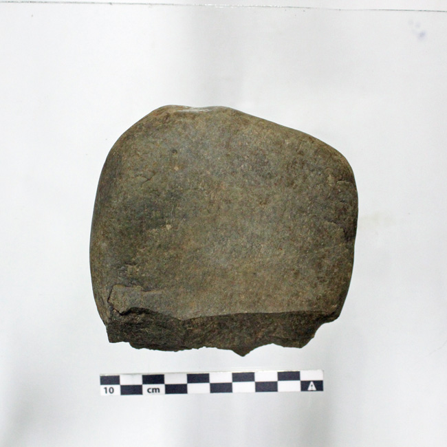 Canto de forma que tiende a ovoide y con un borde recto, de color gris. Tiene un escaso trabajo de talla unifacial y un borde activo. El sector proximal conserva la corteza natural.