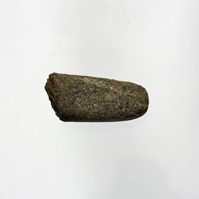 Pieza pequeña, de color gris oscuro y forma oblonga, con el extremo convexo y desgastado. Está fractura de manera transversal. Una de sus caras es de superficie recta y pulida, indicando un adelgazamiento por uso.