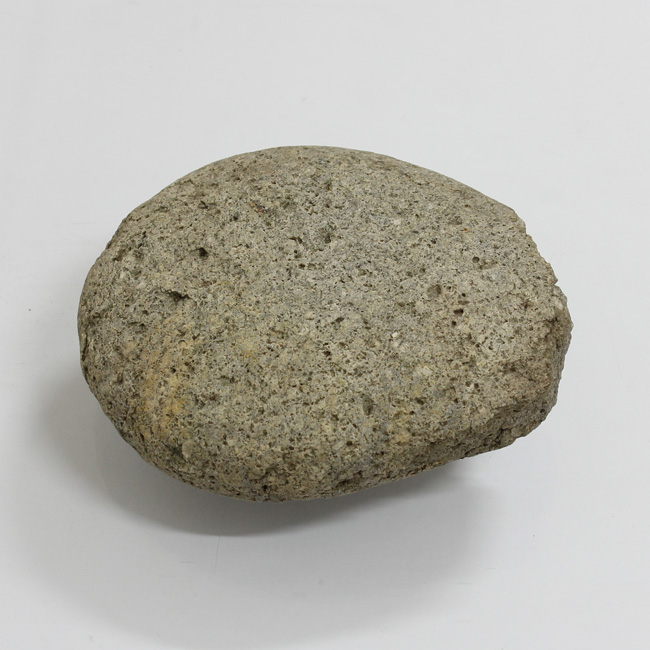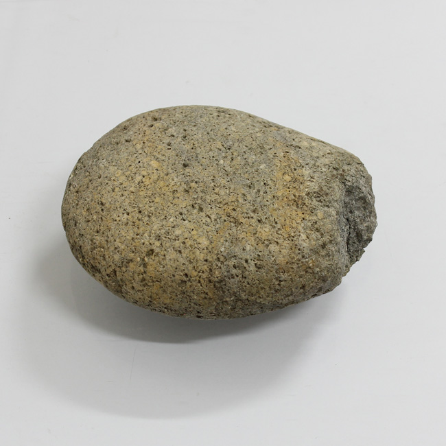 Pieza grande de forma ovoide y de color gris claro con inclusiones marrones y de silicatos. La superficie funcional se aprecia aplanada y levemente rebajada; tiene un extremo fracturado. El borde es redondeado y está rebajado en un extremo; el perfil es plano convexo.