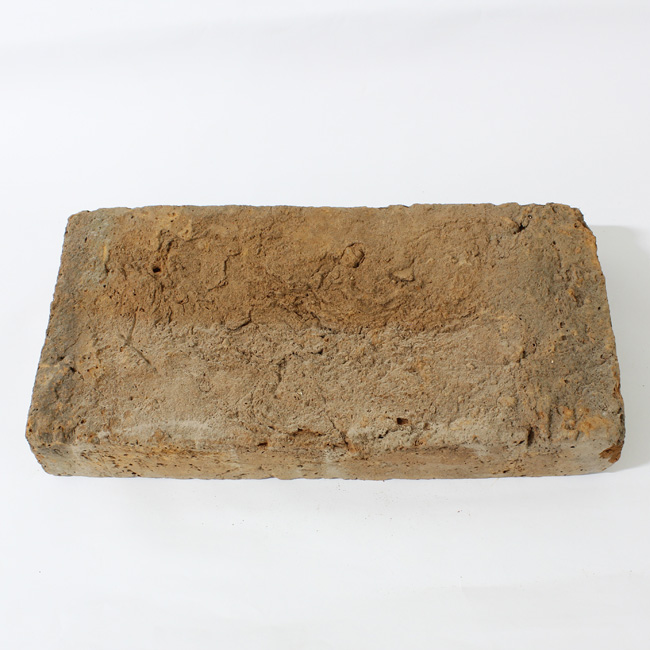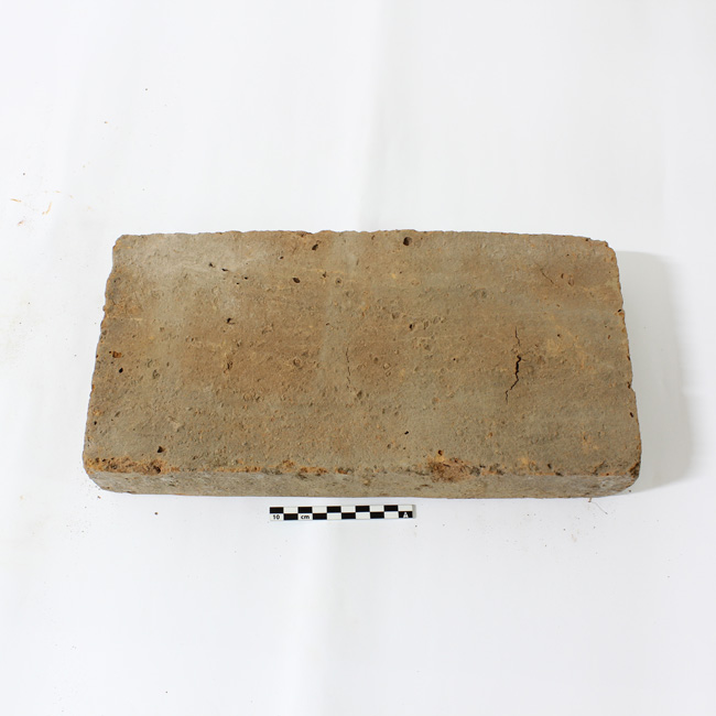 Pieza competa de color anaranjado rojizo y de forma paralelepípeda rectangular; tiene restos de sedimento. Es una pieza maciza, de tipo fiscal, sin perforaciones en la tabla. Hay erosión en el borde de la testa.