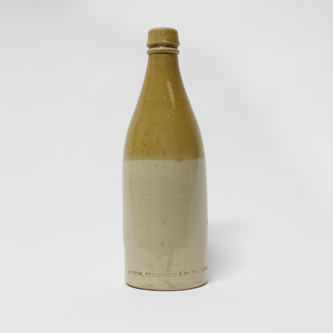 Pieza completa, restaurada, de forma cilíndrica de color beige la sección inferior, y color marrón en la sección superior. Tiene faltantes en el borde del labio. Es una pieza simétrica, de estructura restringida con cuello, de perfil compuesto; la base es circular levemente cóncava hacia el interior, y de contorno plano. La botella es de tipo sinusoidal con el cuerpo cilíndrico; los hombros suavemente redondeados, cuello cónico con un anillo redondeado en la sección superior. La boca es de labio levemente redondeado y borde amplio, tipo listón superpuesto, con preparación para cierre a presión. El cuerpo presenta algunas irregularidades, y en el talón tiene impreso en bajo relieve la marca del importador “ROGERS, SYMINGTON & Co VALPARAISO”. Es una botella de cerveza.