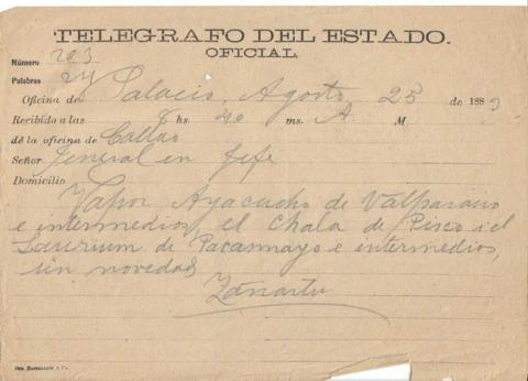 Conjunto de telegramas del Gobierno de Chile en Perú. Lápiz grafito sobre hojas de papel con líneas horizontales. Fechados en 1883.