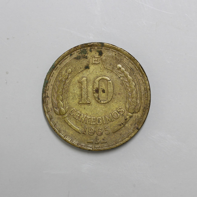 Pieza completa de forma circular y de color dorado, con pequeños focos de óxido en ambas caras. El anverso tiene la imagen de un cóndor a la izquierda y en vuelo, y la leyenda perimetral orientada hacia el exterior “REPUBLICA –DE CHILE”. El reverso muestra una corona de espigas y la denominación y año de acuñación: E/ 10/ CENTESIMOS/ 1965; y en el extremo inferior la ceca de Santiago. La gráfila es guionada y el canto liso. La posición de los cuños es 6:00 h.