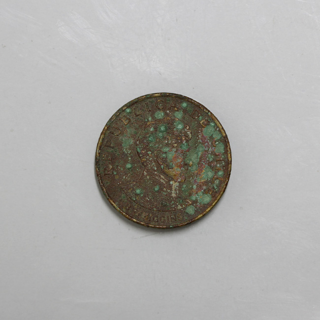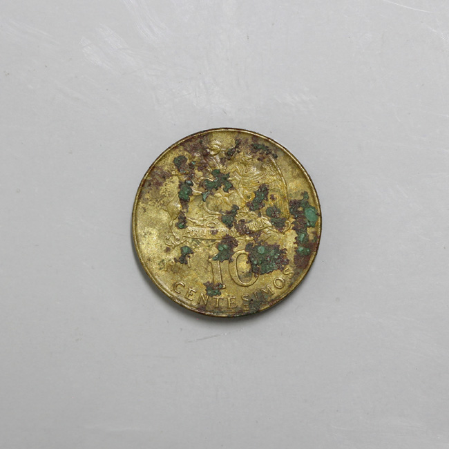 Pieza completa de forma circular y de color dorado. Ambas caras presentan focos de óxido. El anverso muestra el busto de B. O’Higgins a la derecha, y la leyenda perimetral “REPUBLICA DE CHILE”, y en el extremo inferior “B. O’HIGGINS”. En el reverso se encuentra el escudo nacional y bajo él la denominación: 10/ CENTESIMOS; y a la izquierda el año de acuñación: 1971. la gráfila y el canto son lisos. La posición de los cuños es 6:00 h.