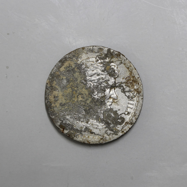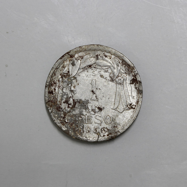 Pieza completa de forma circular y de color plateado. Hay restos de sedimento y óxido en ambas caras. El anverso muestra el busto de O’Higgins a la derecha y la leyenda perimetral “REPUBLICA - DE CHILE”, y en el costado derecho “BERNARDO/ O’HIGGINS”. En el reverso se observa un manto de copihues y al centro la denominación y año de acuñación: 1/ UN/ PESO/ 1956. En la parte superior se localiza la ceca de Santiago. La gráfila es acordonada y el canto liso. La posición de los cuños es 7:00 h.