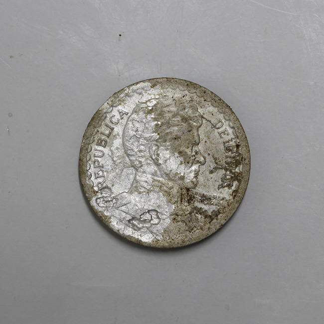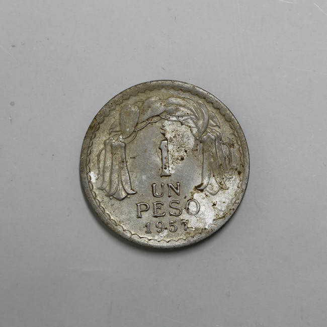 Pieza completa de forma circular y de color plateado cubierta en parte por una pátina grisácea. En el anverso hay leves faltantes en el extremo inferior; este muestra el busto de O’Higgins a la derecha y la leyenda perimetral “REPUBLICA - DE CHILE”, y en el costado derecho “BERNARDO/ O’HIGGINS”. En el reverso se observa un manto de copihues y al centro la denominación y año de acuñación: 1/ UN/ PESO/ 1957. En la parte superior se localiza la ceca de Santiago. La gráfila es acordonada y el canto liso. La posición de los cuños es 7:00 h.