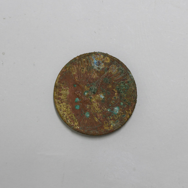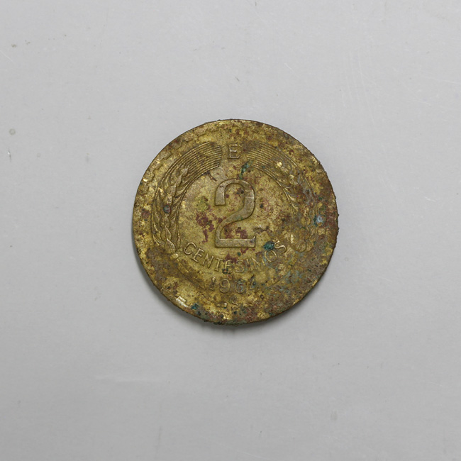 Pieza completa de forma circular y de color dorado, cubierta en parte por una pátina marrón rojizo. En el anverso hay focos pequeños de óxido de cobre. En el anverso se observa la figura de un cóndor a la izquierda en vuelo, y la leyenda perimetral hacia el exterior “REPUBLICA – DE CHILE”. En el reverso se encuentra una corona de espigas, y al centro la denominación y año de acuñación: E/ 2/ CENTESIMOS/ 1964. En el extremo inferior se halla la marca de ceca de Santiago. La gráfila es guionada y el canto liso. La posición de los cuños es 5:00 h.