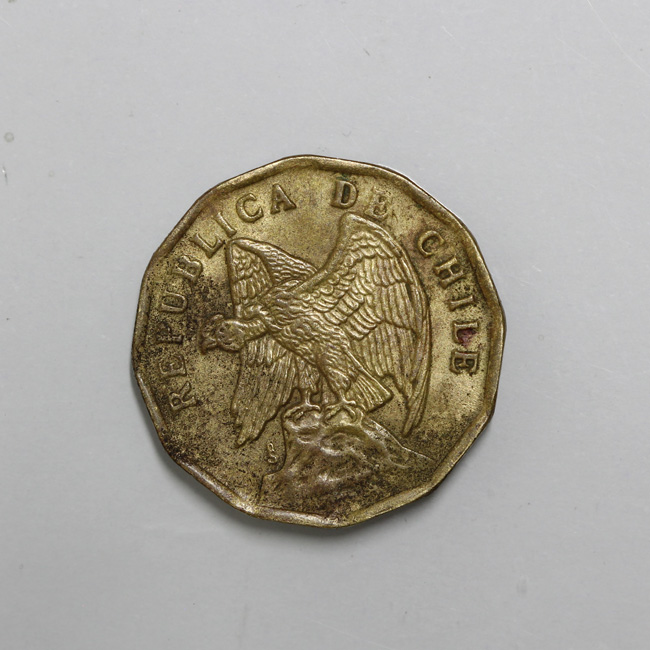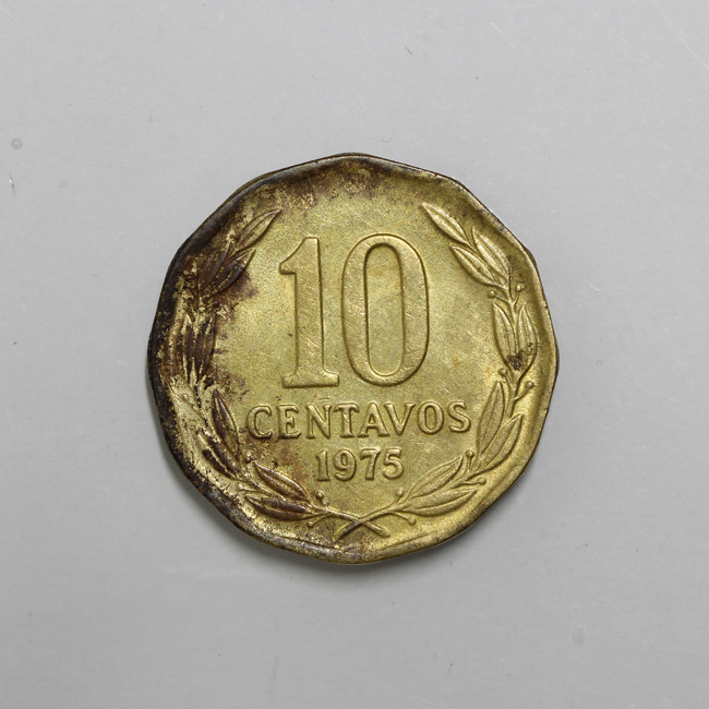 Pieza completa, de forma dodecágona y de color dorado; tiene manchas en algunos sectores. El anverso muestra la figura de un cóndor a la izquierda con las alas semi plegadas y posado sobre una roca, y la inscripción perimetral “REPUBLICA DE CHILE”. En el reverso se observa una corona de laureles y al centro la denominación y año de acuñación: 10/ CENTAVOS/ 1975. La gráfila y el canto son lisos; la posición de los cuños es 6:00 h.
