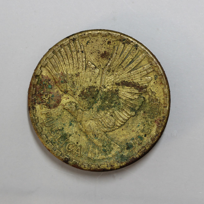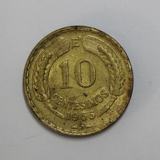 Pieza de forma circular y de color dorado, con restos de óxido en una de sus caras. El anverso muestra la figura de un cóndor en vuelo a la izquierda, y la inscripción exterior perimetral en el margen inferior “REPUBLICA - DE CHILE”. En el reverso se observa una corona de espigas y al centro la denominación y año de acuñación: E°/ 10/ CENTESIMOS/ 1966, y en el extremo inferior la marca de ceca de Santiago.. La gráfila es guionada y el canto liso; la posición de los cuños es 6:00 h.