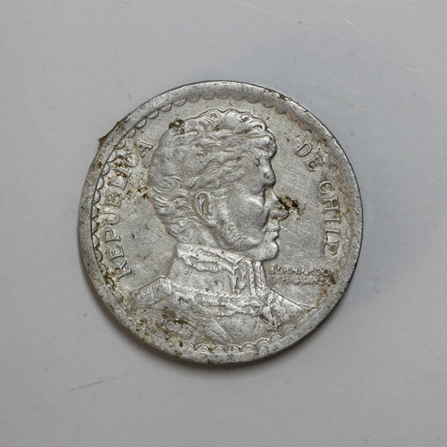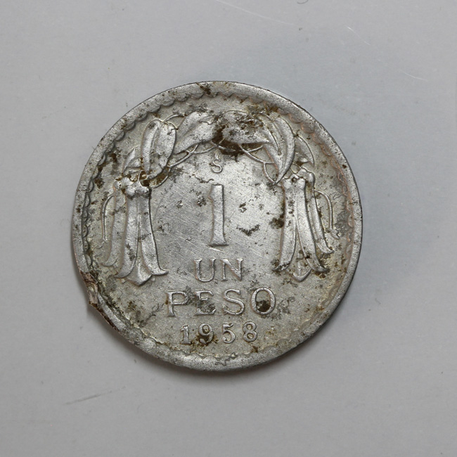 Pieza de forma circular y de color plateado. El anverso muestra el busto del prócer a la derecha y la inscripción perimetral “REPUBLICA–DE CHILE”, y al costado derecho la leyenda “BERNARDO O’HIGGINS”. En el reverso se observa un manto de copihues y al centro la denominación y año de acuñación: 1/ UN/ PESO/ 1958. La gráfila es acordonada y el canto liso; la posición de los cuños es 6:00 h.
